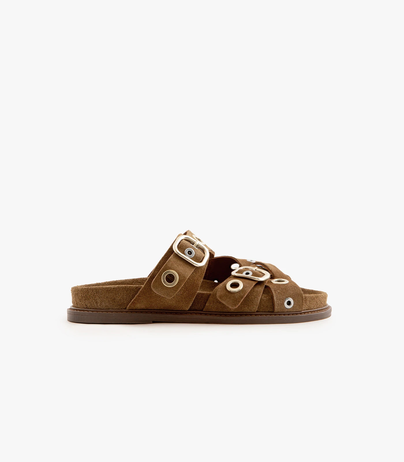 Karine Rivets est une sandale en cuir velours camel, rehaussée de rivets, pour une touche de caractère et une allure estivale affirmée.