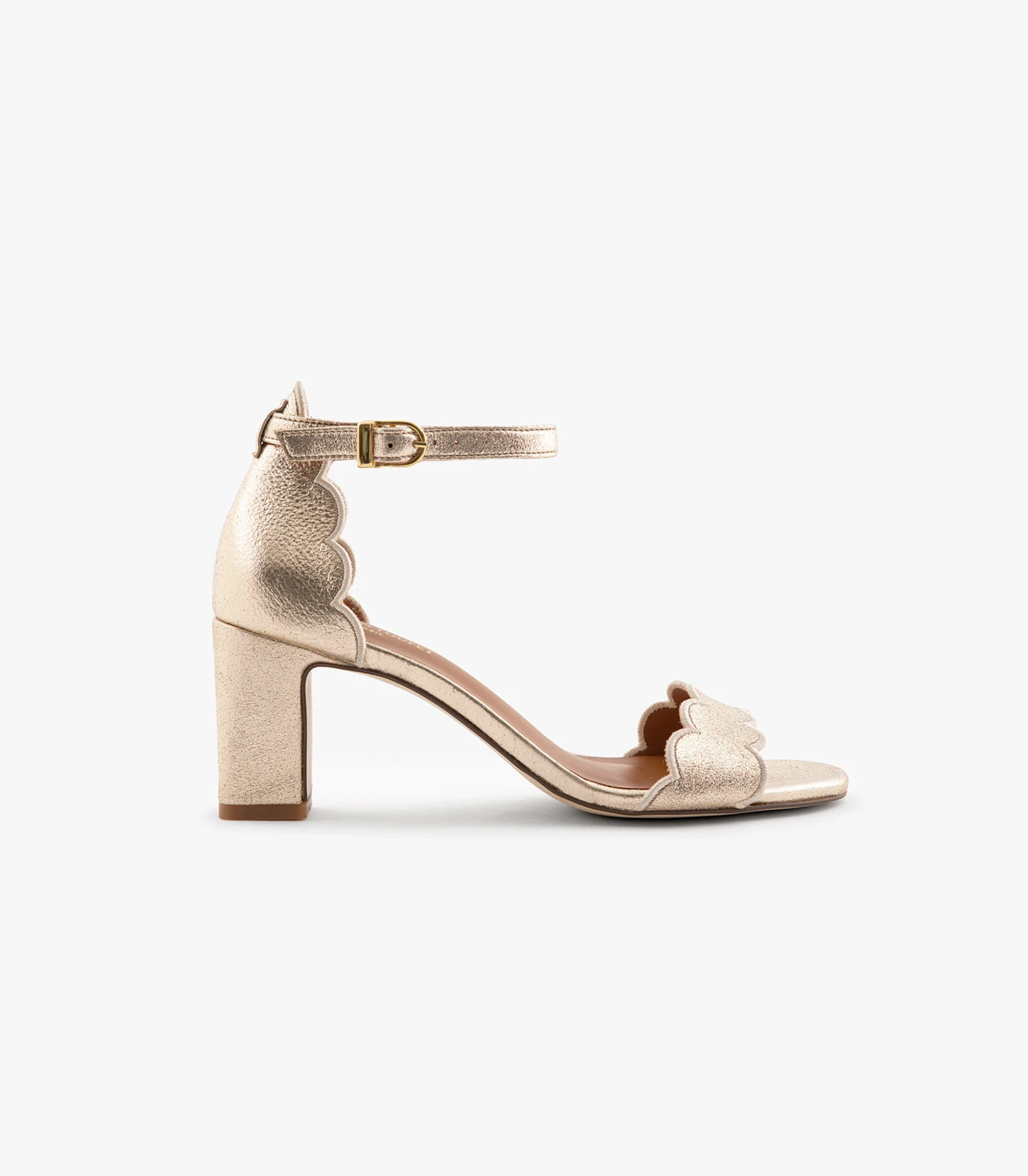 Sandrine est une sandale à talon en cuir pailleté doré clair, lumineuse et élégante, parfaite pour l’été.